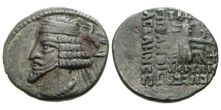 • PHRAATES IV (38-2) DRACHME Aigle derrière le buste Atelier : Ecbatane • Monogramme BAΣIΛEΩΣ BAΣIΛEΩN / APΣAKoY / EYEPΓEToY ΔIKAIoY / EΠIΦANoYΣ ΦIΛEΛΛHNoΣ |