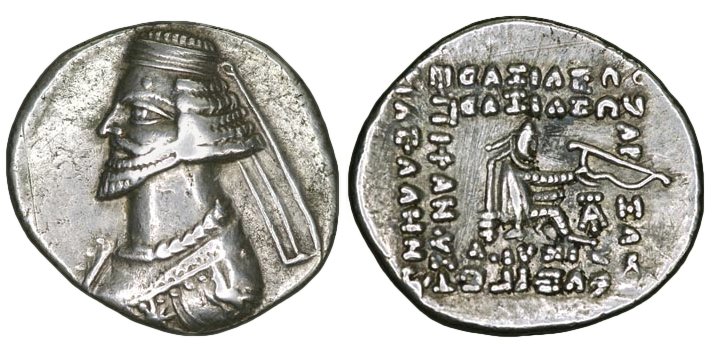 • PHRAATES IV (38-2) DRACHME Atelier : Laodicée • Monogramme Dossier du trône en forme de T BAΣIΛEΩΣ BAΣIΛEΩN / APΣAKoY / EYEPΓEToY ΔIKAIoY / EΠIΦANoYΣ ΦIΛEΛΛHNoΣ |