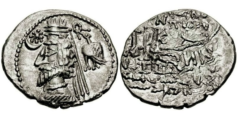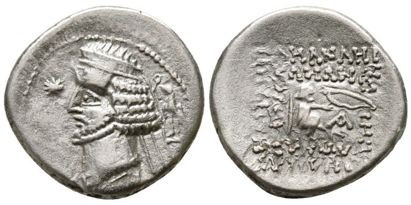 • PHRAATES IV (38-2) DRACHME Avers : A gauche étoile sur un croissant ; à droite un aigle Atelier : Ecbatane • Monogramme BAΣIΛEΩΣ BAΣIΛEΩN / APΣAKoY / EYEPΓEToY ΔIKAIoY / EΠIΦANoYΣ ΦIΛEΛΛHNoΣ |