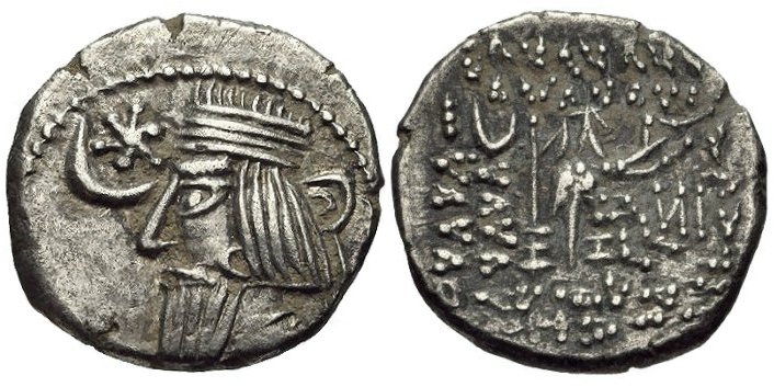 • ARTABAN IV (10-38) DRACHME • (Attribution Sellwood : Artaban II) Atelier : Ecbatane • Monogramme BACIΛEΩC BACIΛEΩN / APCAKOY / EYEPΓETOY ΔIKAIOY / EΠIΦANOYC ΦIΛEΛΛHNOC |