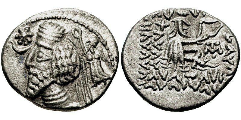 • PHRAATACES & MUSA DRACHME Av Victoires de part et d'autre du buste Atelier : Rhagae • Monogramme ΘEAC + (incohérent) MOYCH + (incohérent) |