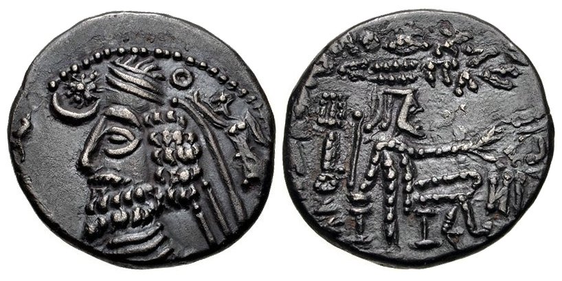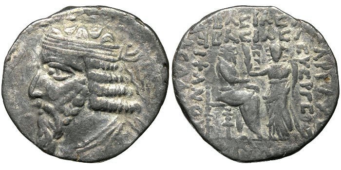 • PHRAATACES (2 av. - 4 après J.-C.) TETRADRACHME • Victoires de part et d'autre du buste Atelier : Séleucie • AIT (verticalement) Le Roi trônant à droite tenant un arc BACIΛEΩC BACIΛEΩN / APCAKOY EYEPΓETOY / ΔIKAIOY (←) / EΠIΦANOYC ΦIΛEΛΛHNOC |