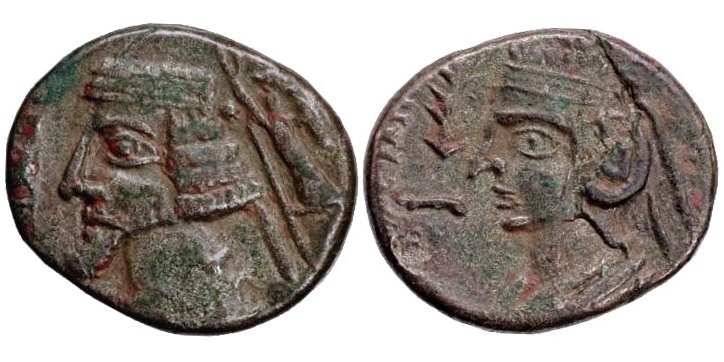 • PHRAATACES & MUSA DRACHME Av Victoires de part et d'autre du buste Rv Palme devant le buste Atelier : Suse • Pas de monogramme Légende indéchiffrable |