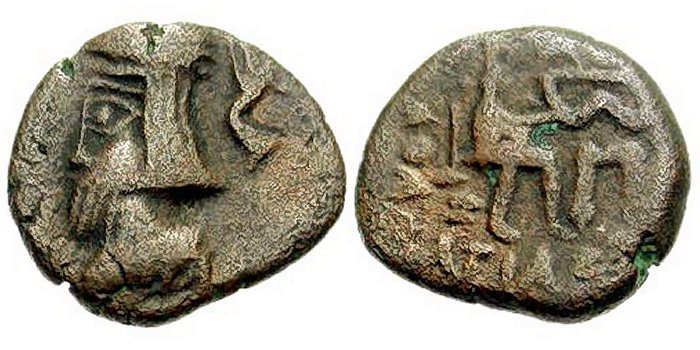• ARTABAN IV (10-38) DRACHME de bronze Avers : Etoile sur un croissant Atelier : Margiane • Monogramme Légende incohérente |