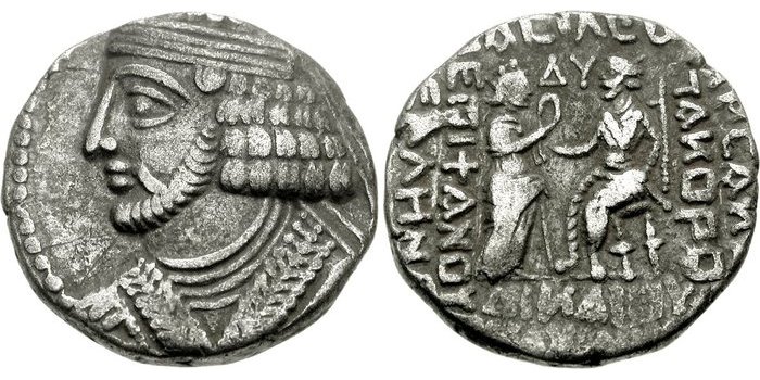 • PACORUS II (78-105) TETRADRACHME • Atelier : Séleucie Le Roi à cheval à gauche recevant un diadème de Tyche. Derrière Tyche un homme avec un diadème ouvert BACIΛEωC BACIΛEωN / APCAKOY ΠAKOPOY / ΔIKAIOY / EΠIΦANOYC ΦIΛEΛΛHNOC |