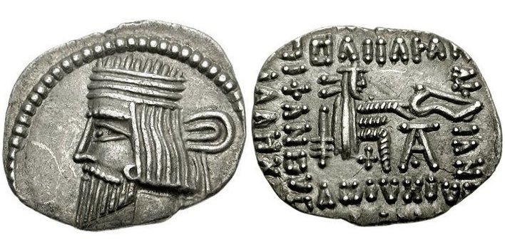 • ARTABAN V (80-90) DRACHME • (Attribution Sellwood : Artaban III) Monogramme Légende grecque dégradée |